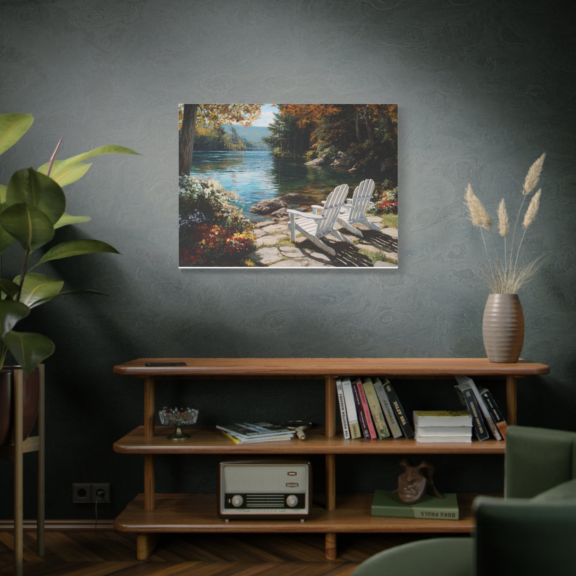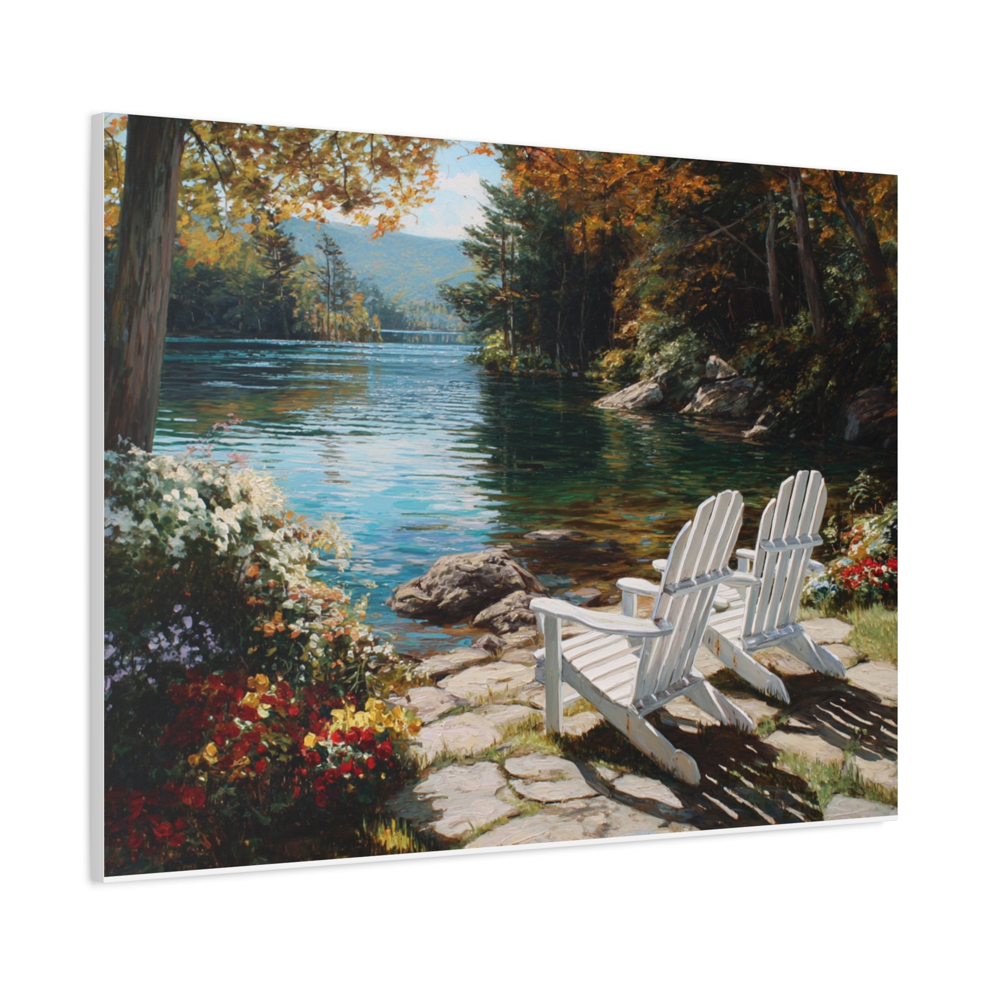 A serene matte canvas print that brings a lakeside afternoon into any room. Two white Adirondack chairs sit on a sun-warmed stone ledge, framed by late-summer wildflowers and the still, glassy water of a hidden cove. The muted matte finish reduces glare and emphasizes painterly brushstrokes and rich, natural tones—greens, golds, and the soft blue of distant hills—so the scene reads like a memory rather than a photograph. Stretched on sustainably sourced pine and coated with a high-quality proprietary finish, this canvas feels substantial on the wall yet light in spirit. Hang it over a mantel, in a reading nook, or beside a hallway to invite quiet mornings and slow afternoons into everyday life.
