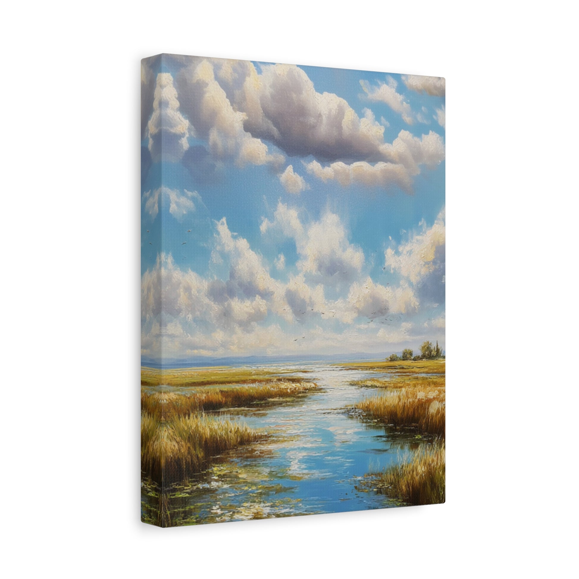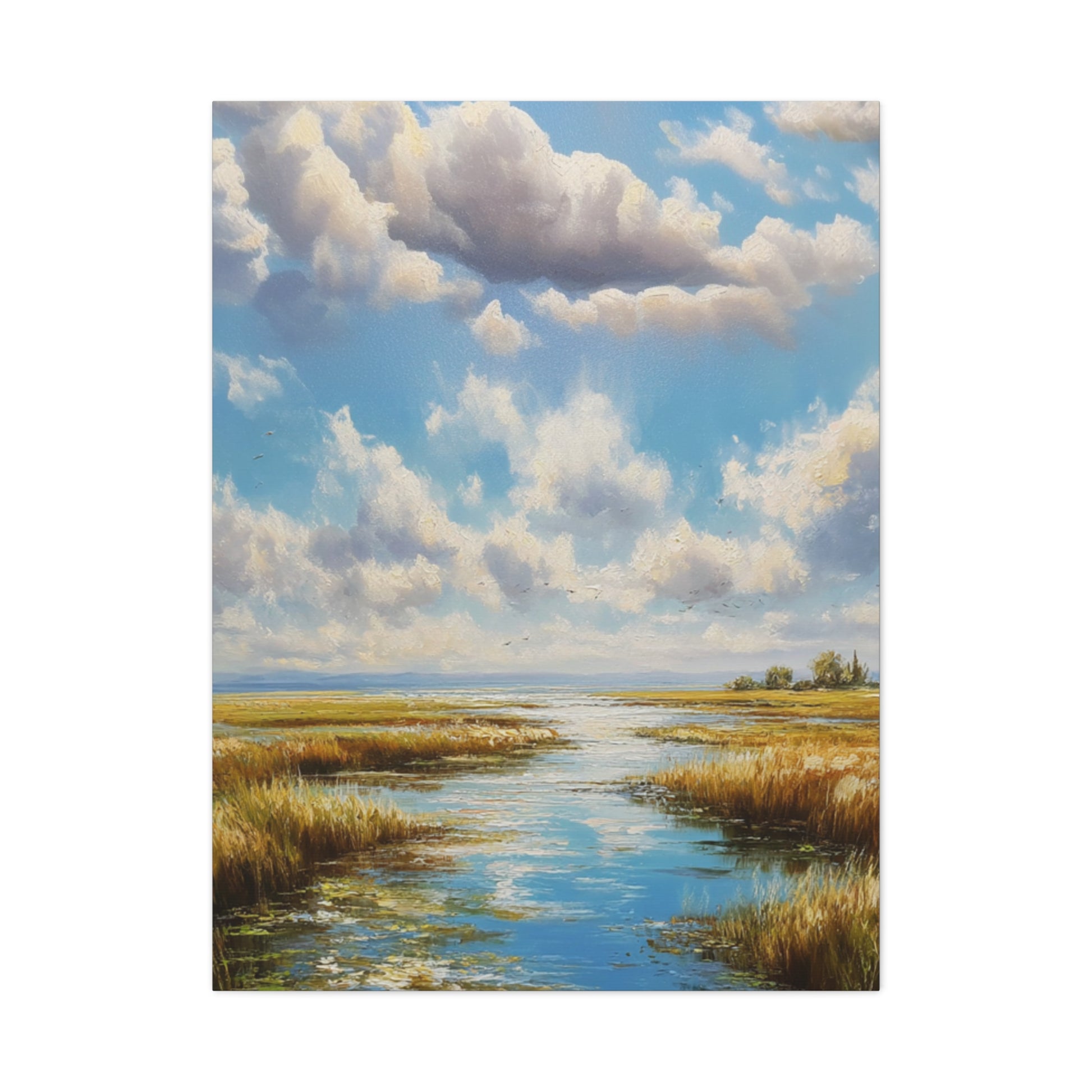 Invite the tranquil beauty of coastal marshlands into your space with this serene vertical canvas print. Soft grasses sway beneath cloud-dappled skies while calm tidal waters reflect the peaceful horizon, creating a sense of stillness and natural harmony.