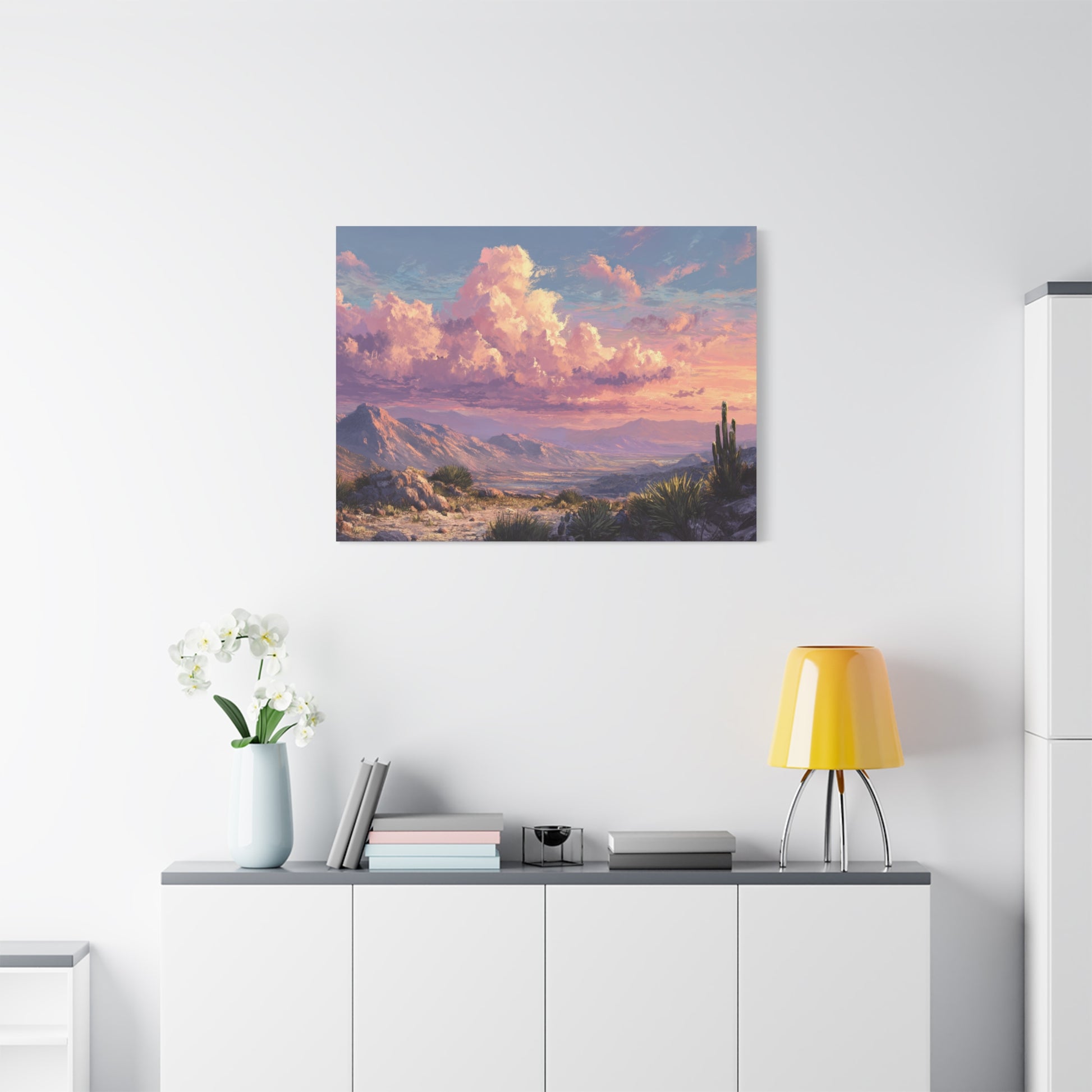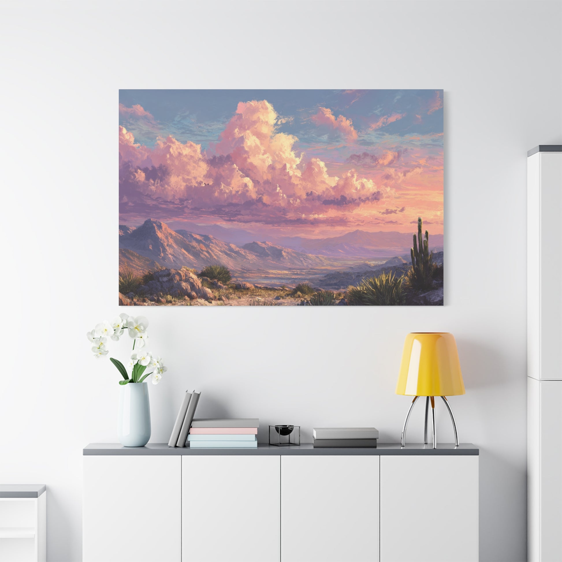 A stretched matte canvas print that brings a wide desert dusk into your space. Soft, painterly clouds blush in peach and lavender over distant mountain ridges, while foreground cacti and scrub catch the last light. The matte finish tames glare and deepens color, giving the scene a serene, gallery-ready presence on a slim 1.25" profile frame. Ready to hang straight from the back, it sits flush and steady thanks to soft rubber dots that protect walls and keep the piece perfectly positioned.