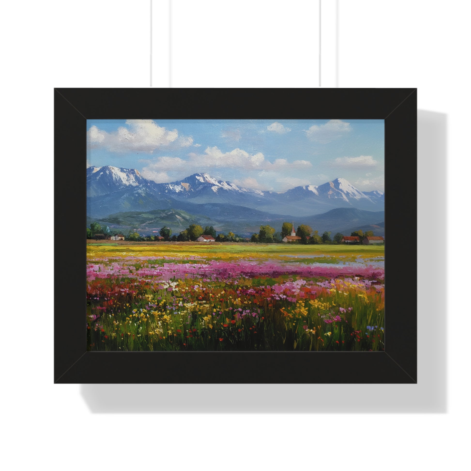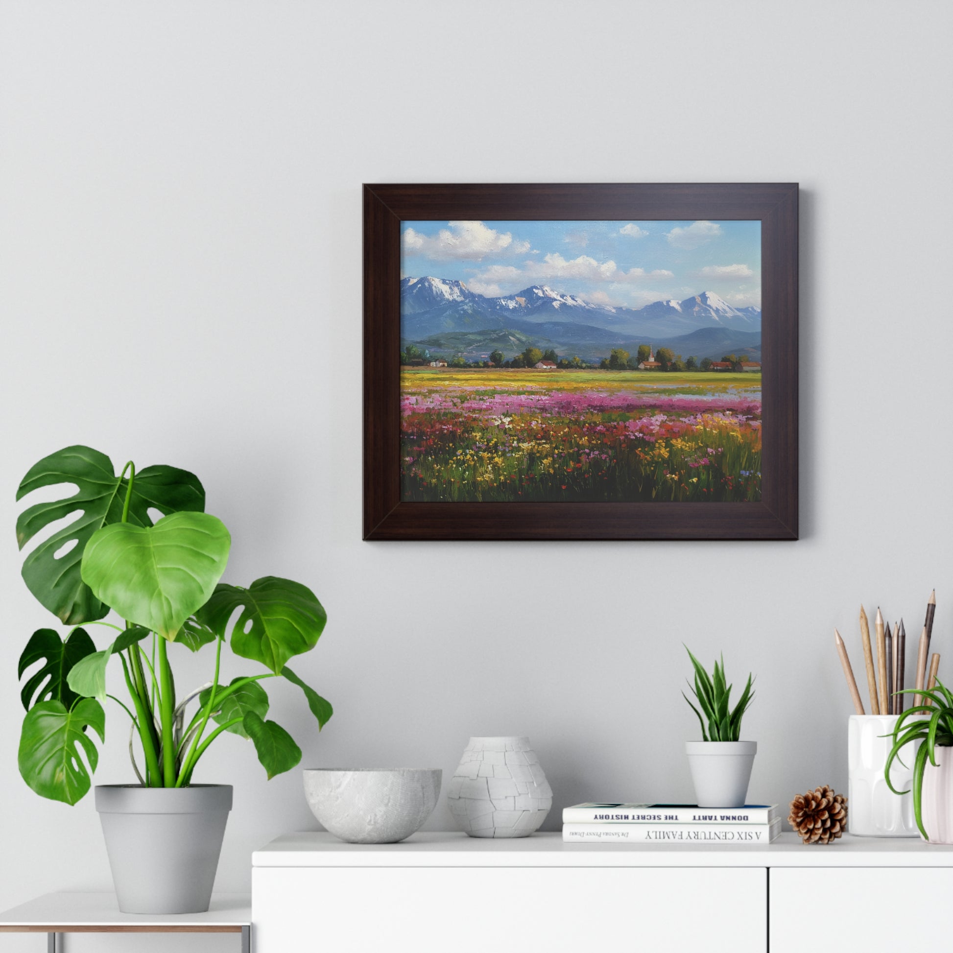 Bring a breath of open air into your living space with this framed horizontal poster. The scene — rolling wildflower meadows leading to snow-kissed peaks under a wide, cloud-streaked sky — invites quiet mornings with coffee or evenings spent unwinding. Printed on archival museum-grade paper with bright pigment inks, the artwork keeps its depth and color for years. A slim MDF frame in black, white, or walnut, topped with a protective acrylic cover and a matte finish, gives the print a refined, gallery feel. The hanging hardware comes pre-installed so the piece arrives ready to hang and settle instantly into a hallway, study, or living room vignette.