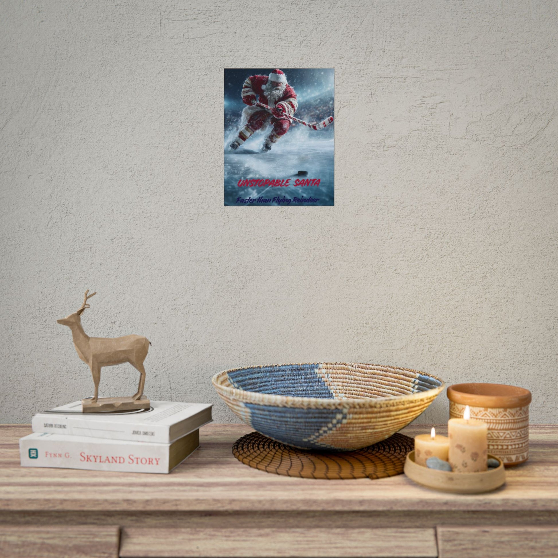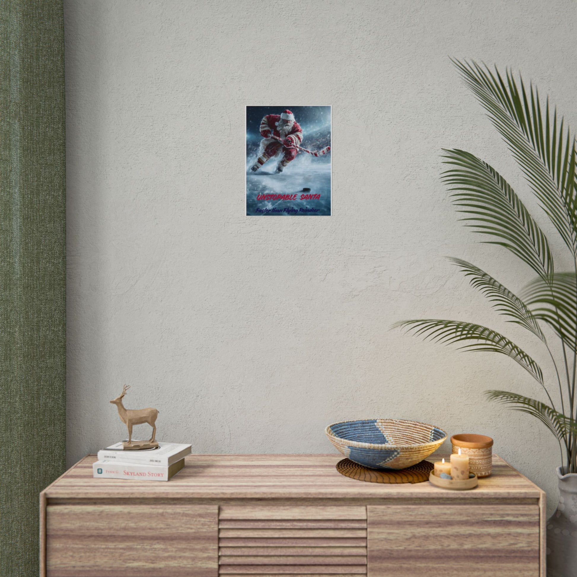 Unstoppable Santa Hockey Poster is a fun holiday wall art that brings a festive and playful vibe to any room. Perfect for those who love hockey and want to add a touch of Christmas spirit to their decor. Ideal for holiday celebrations and winter sports enthusiasts.