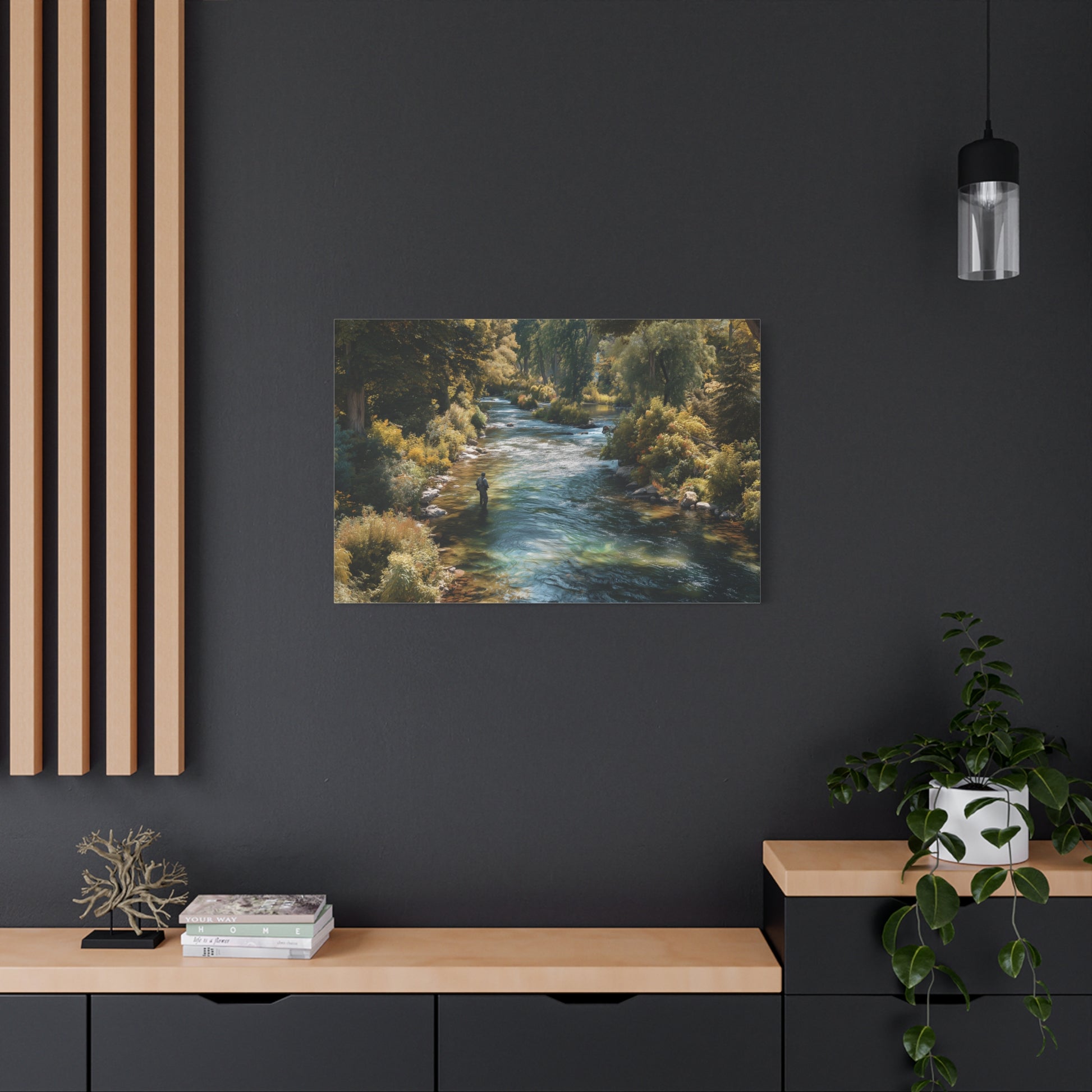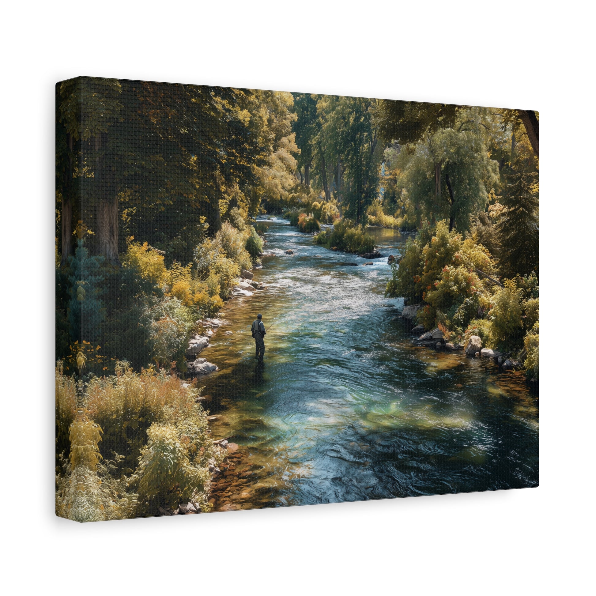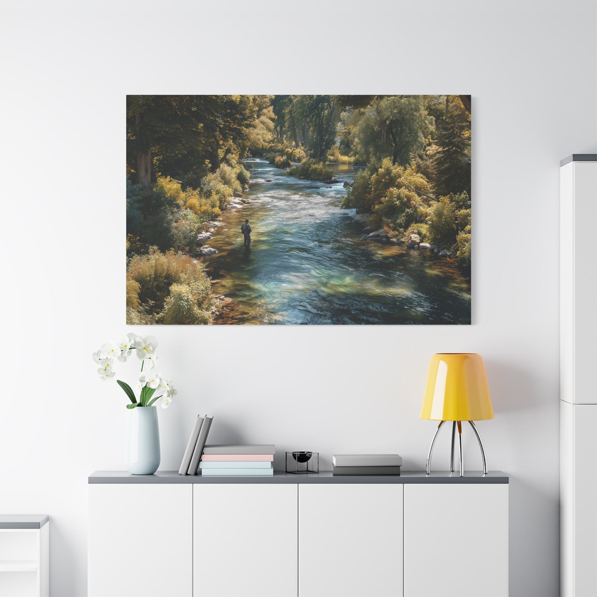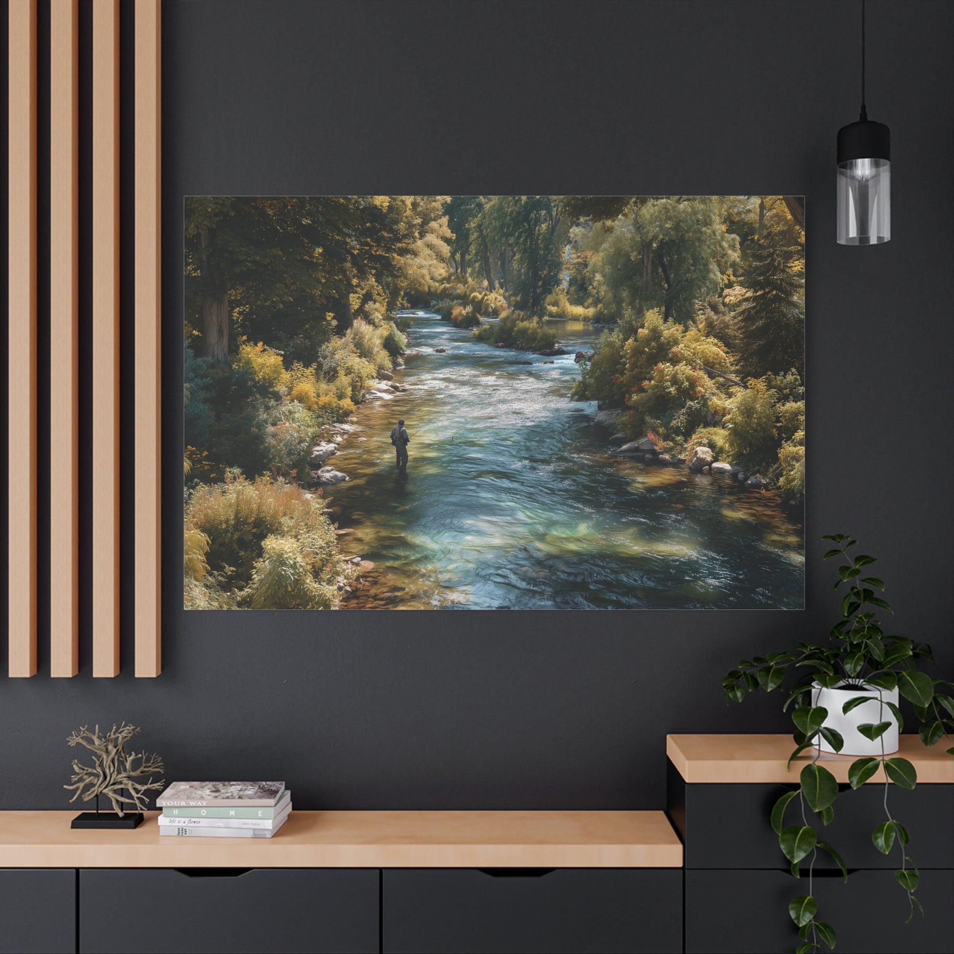 River Fishing Canvas Wall Art — Serene Forest Stream Matte Stretched Print