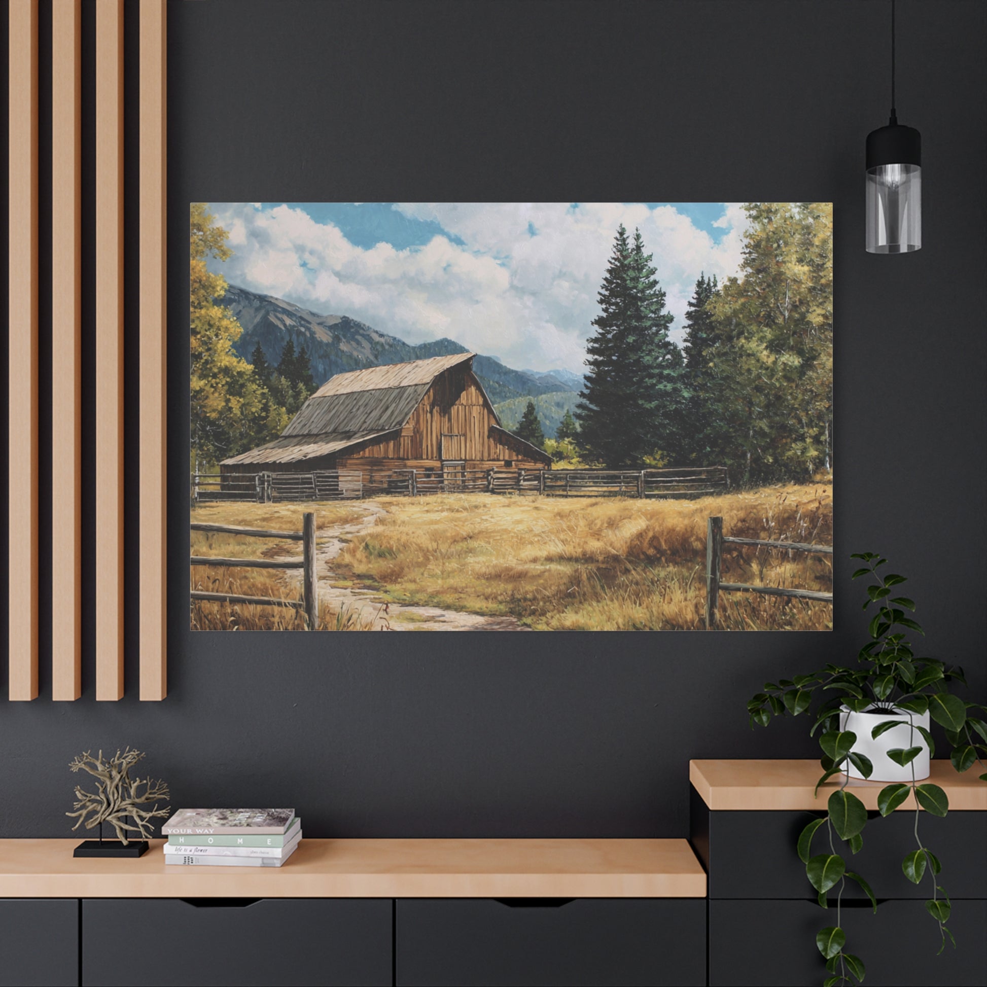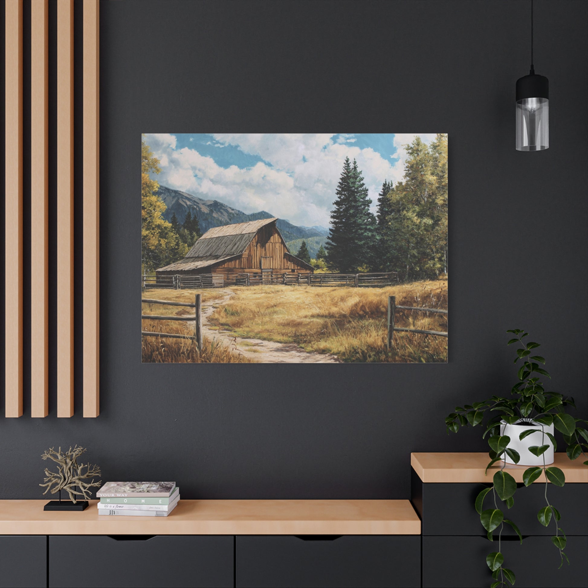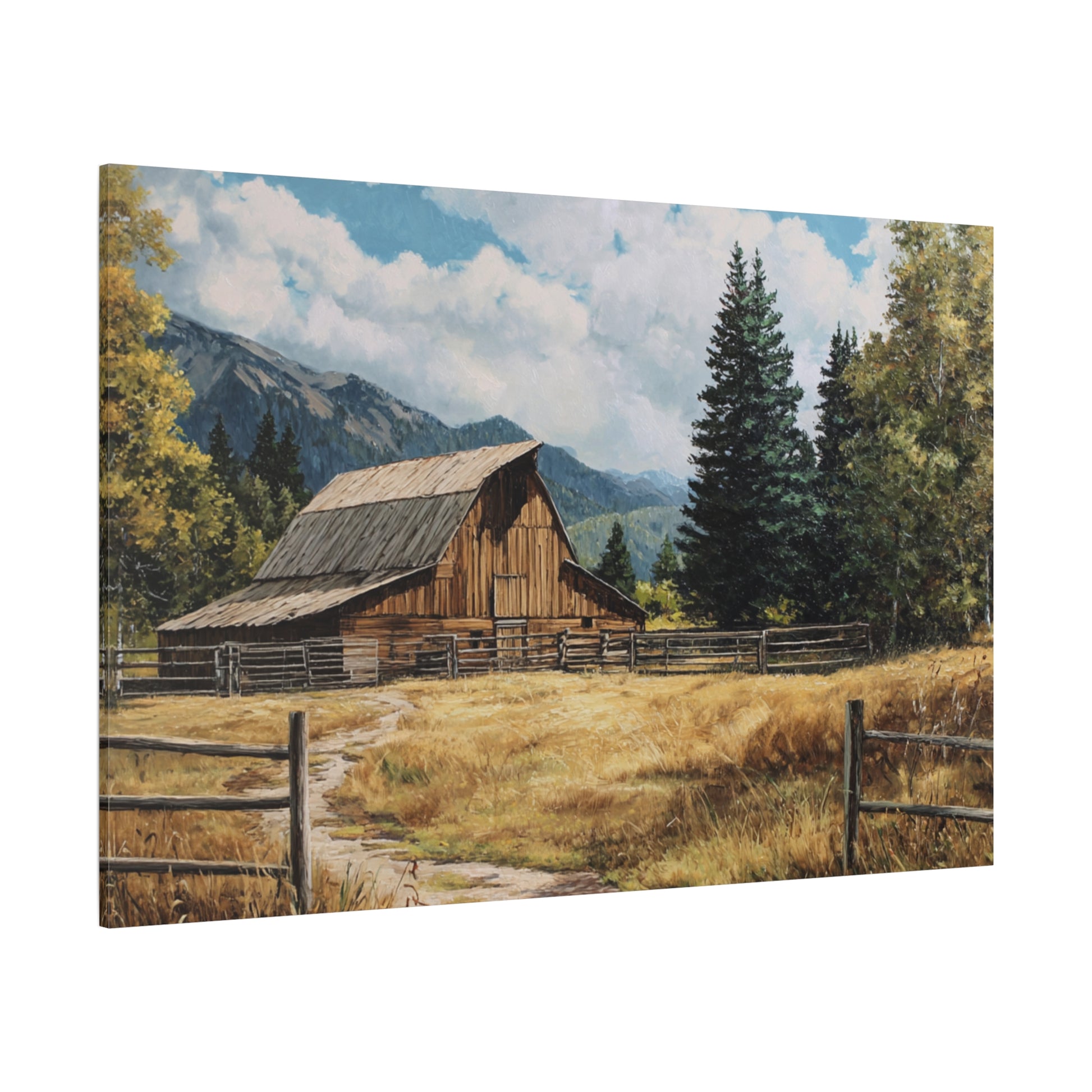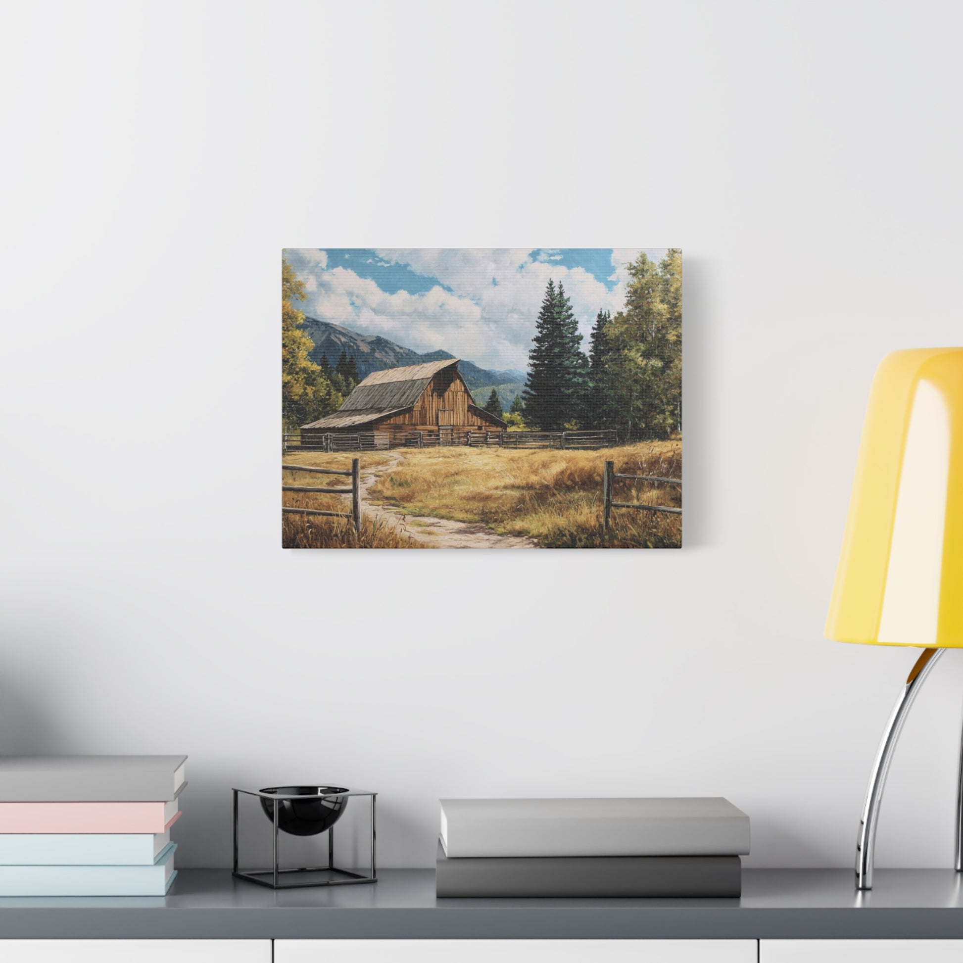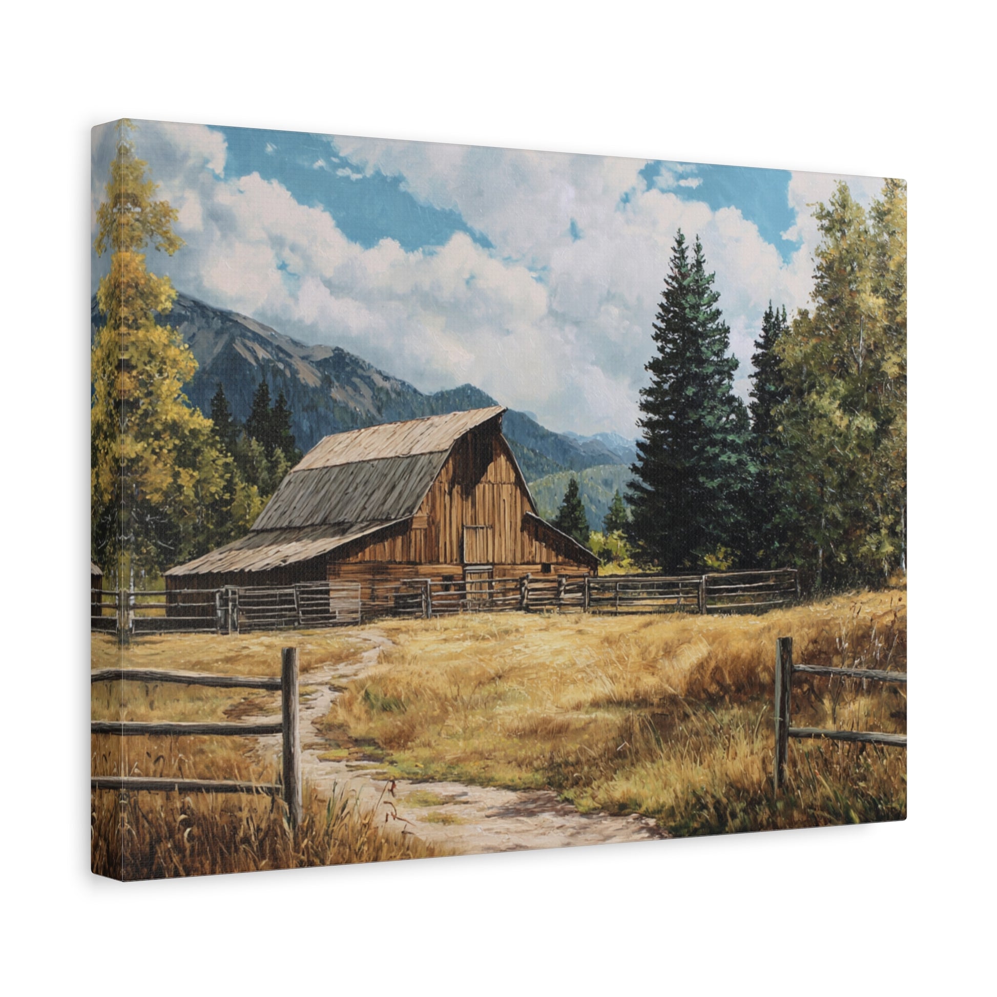 A stretched matte canvas print that brings a quiet country scene into your home. The artwork depicts a sunlit barn framed by golden fields, a split-rail fence, and distant mountains under a bright sky. Printed with UL-certified Greenguard Gold latex inks on a cotton-poly canvas with a unique coating that preserves detail and color depth. The canvas is stretched over a sustainable radiata pine frame, includes soft rubber dots on the lower back to keep it steady on the wall, and comes ready to hang. Subtle texture and a matte finish give the piece a painterly, timeless feel that complements rustic, farmhouse, and nature-themed rooms.