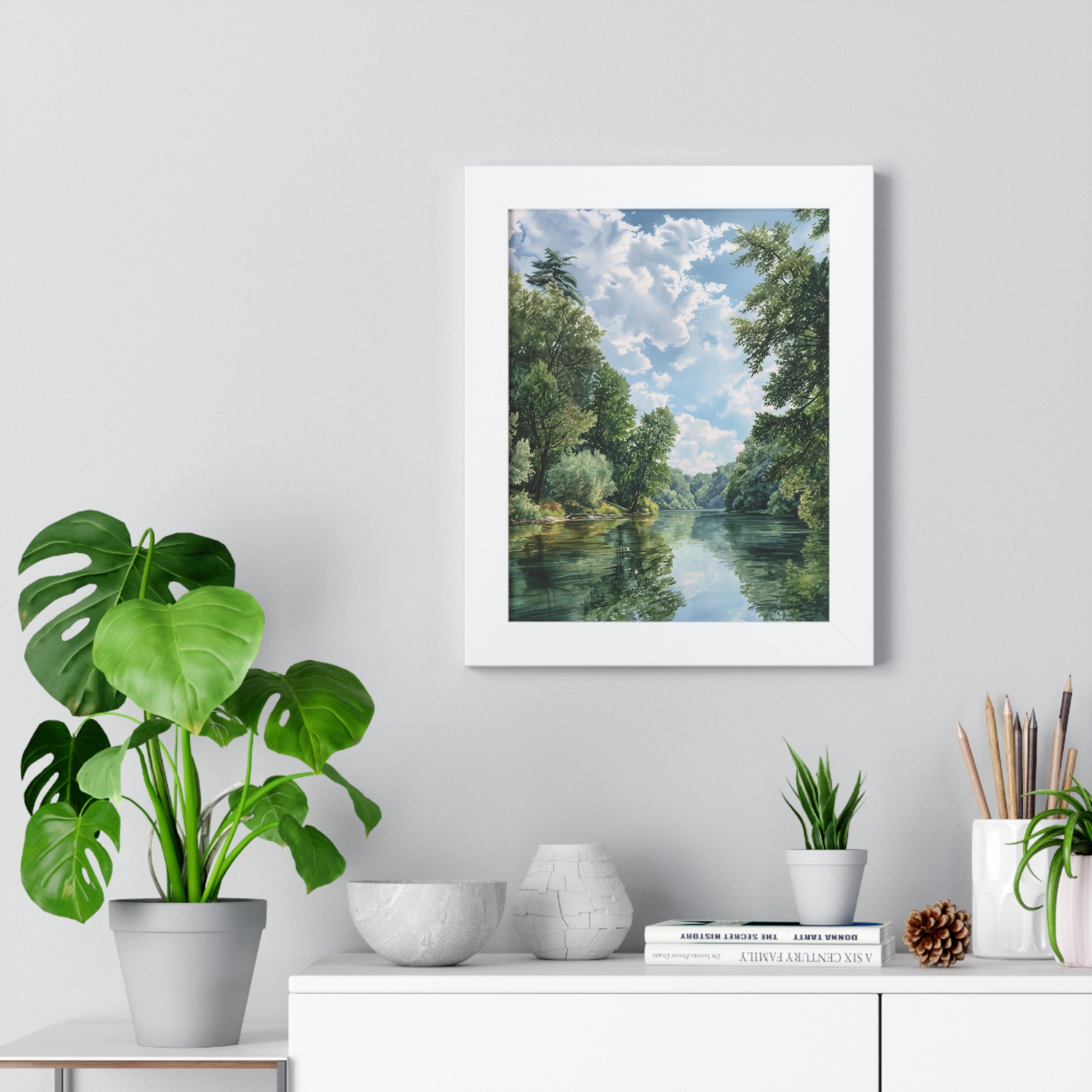 A vertical framed print that brings a calm riverside morning into your home. Printed on museum-grade matte paper, the artwork’s soft clouds, leafy trees, and mirror-like water stay true and vibrant over time. Choose a slim black, white, or walnut frame in either lightweight Ayous wood or sturdy MDF — each option includes a protective acrylic cover and easy hanging hardware so the piece arrives ready to display. The print’s fine detail and archival paper make it feel like a window to a quiet landscape rather than just wall decor.